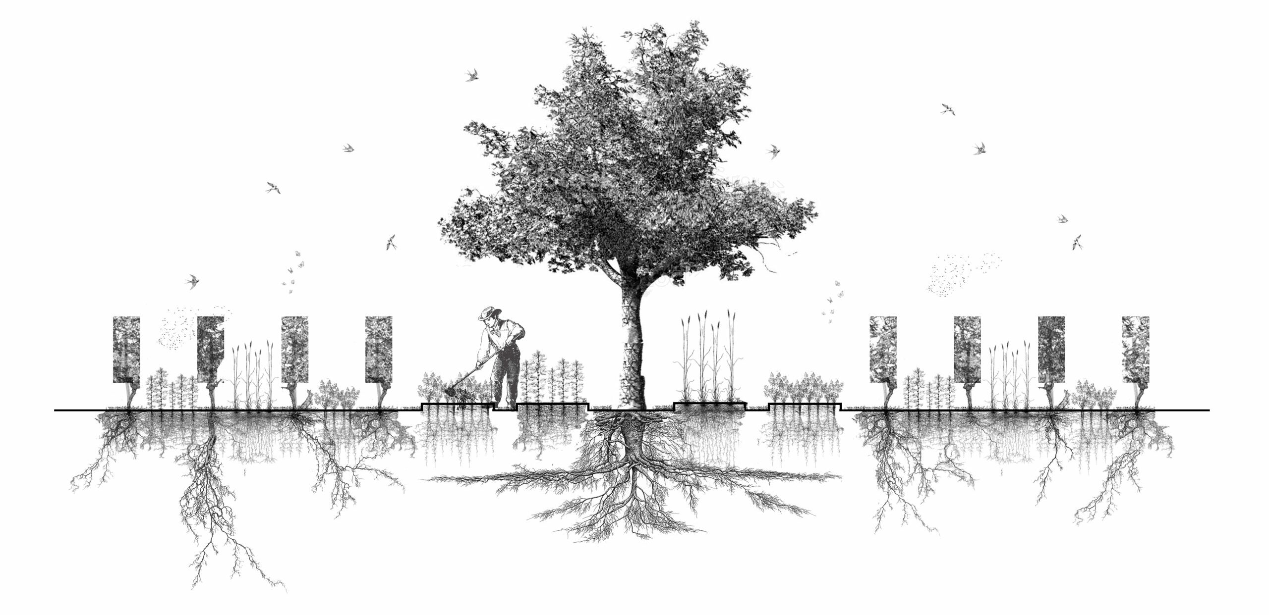 Il s’agit de combiner et de densifier les cultures en les étageant pour exploiter toute la lumière et partager toutes les ressources du sol. Ainsi, une grande treille de 800m² est implantée pour optimiser cette recherche en créant 2 étages de culture parfaitement plans. Une culture classique de maraichage organisé en planche au rez-de-jardin et au dessus, à l’étage, une culture de plantes grimpantes (vignes, fleurs comestibles et courges) qui courent sur une treilles mesurant 12m de largeur par 75m de longueur.
